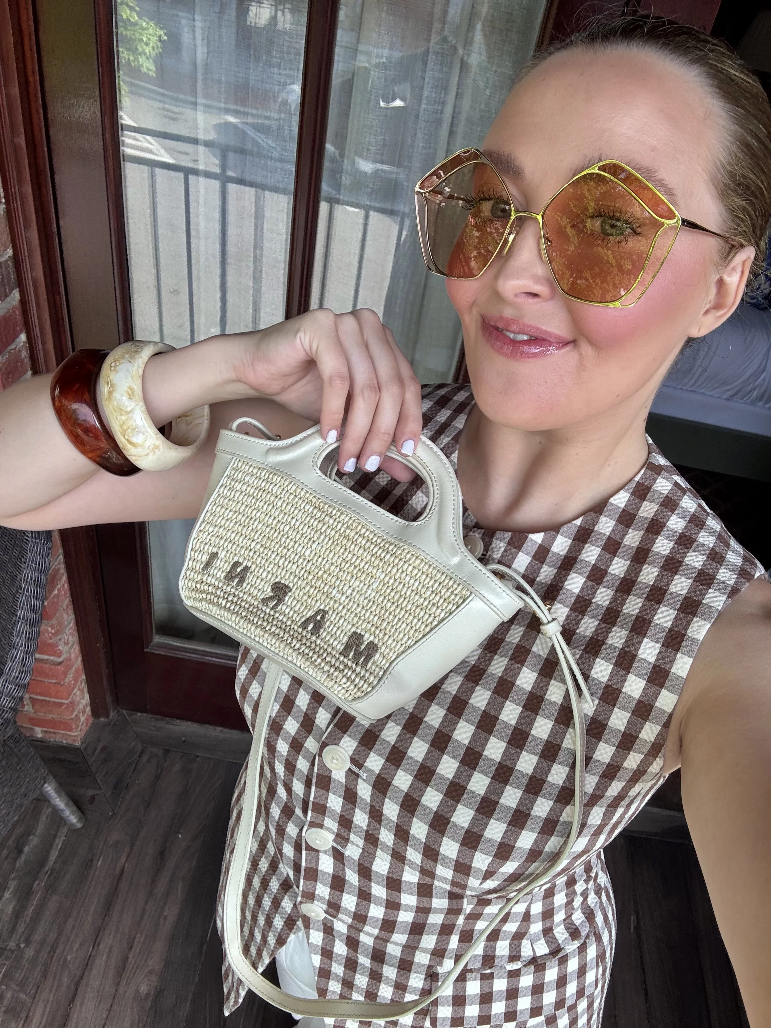 A woman taking a selfie outdoors on a porch is holding a mini Marni handbag. She is wearing large orange-tinted sunglasses, a checkered dress with buttons, and a large amber bracelet on her wrist.