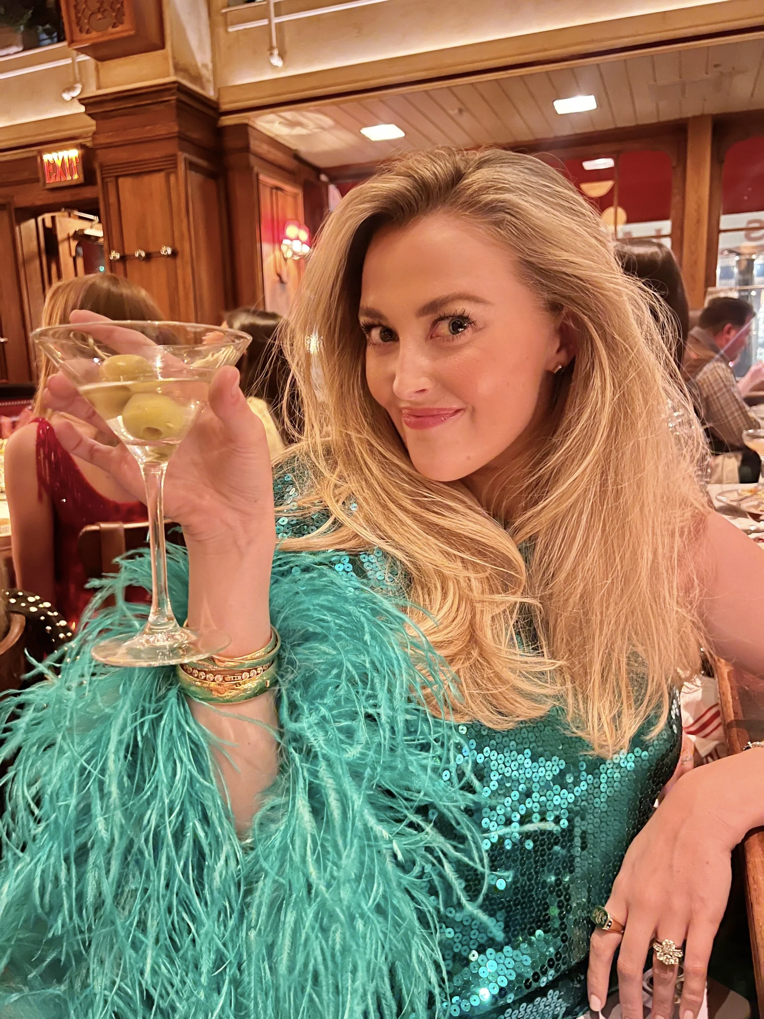 A woman with long, wavy blonde hair, wearing a teal sequined dress and a green feathered shawl, holding a martini glass with green olives, seated in a restaurant or bar with wooden decor, other patrons in the background.